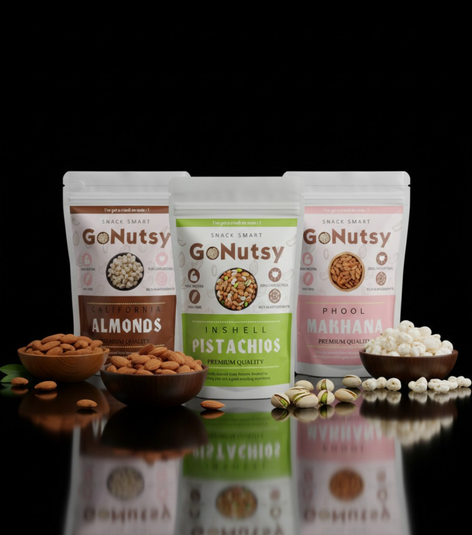 GoNutsy Crunchy Wellness Trio – California Almonds, Premium Pistachios & Phool Makhana