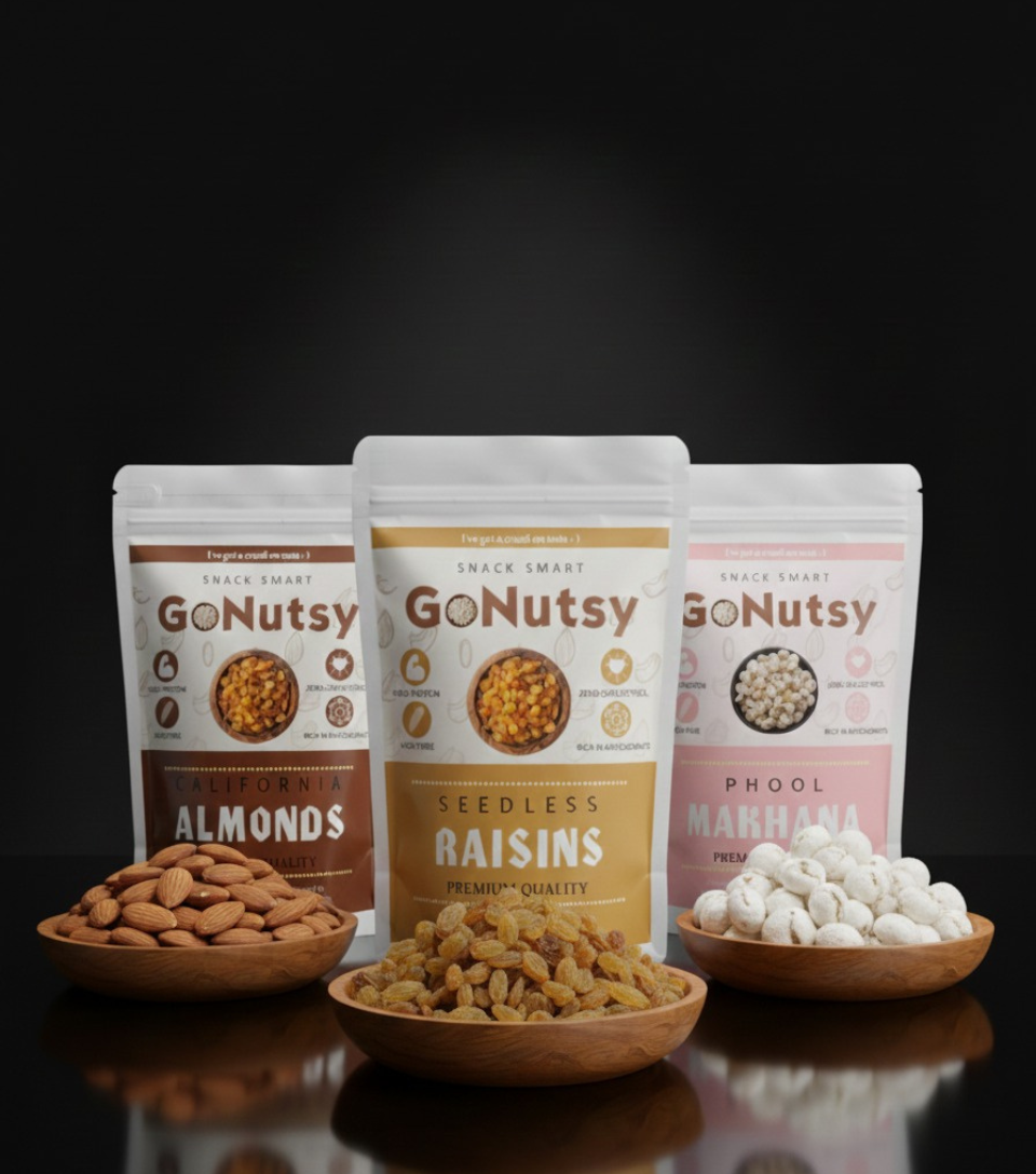 GoNutsy Delight Trio – California Almonds, Phool Makhana & Premium Raisins