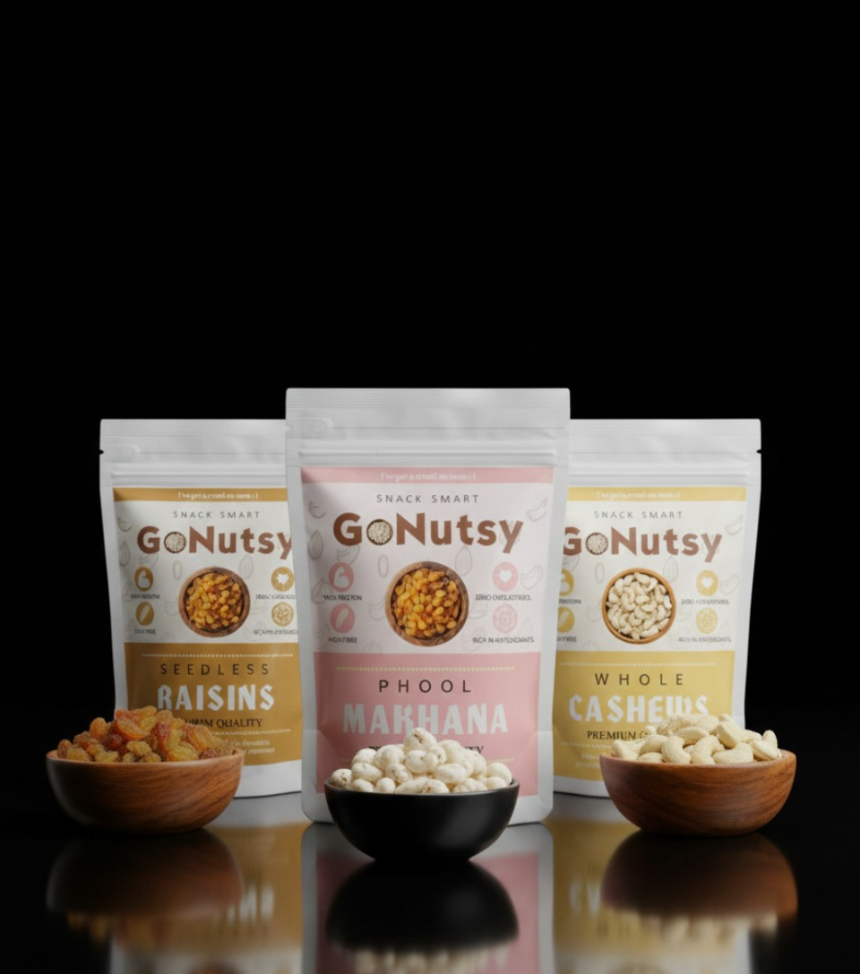 GoNutsy Lite & Luxe Trio – Premium Cashews, Phool Makhana & Sweet Raisins