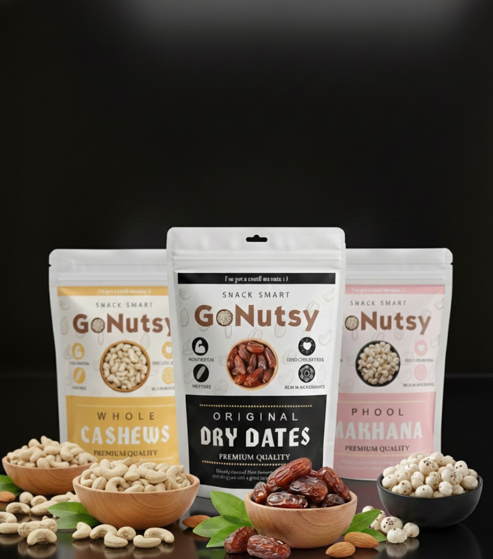 GoNutsy Premium Crunch & Energy Trio – Phool Makhana, Whole Cashews & Dry Dates
