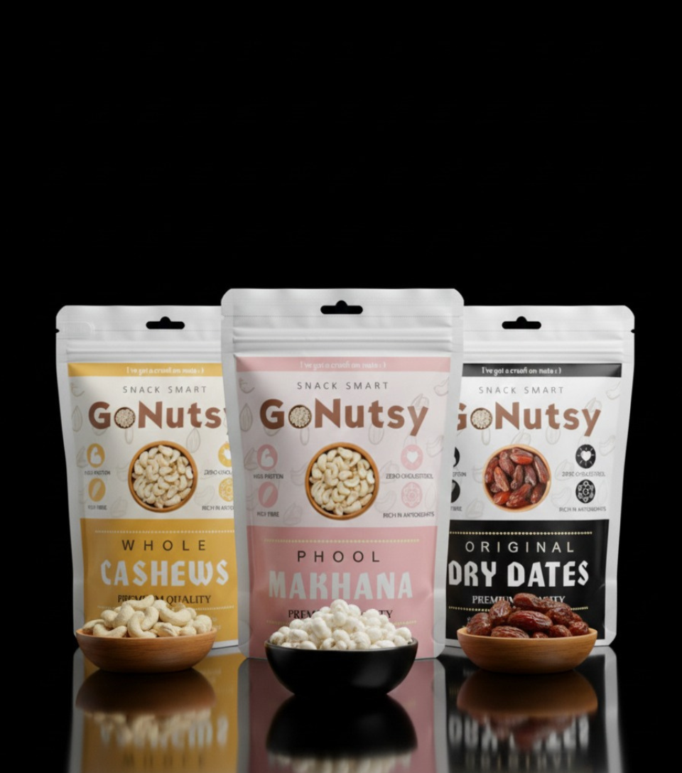 GoNutsy Premium Wholesome Trio – Whole Cashews, Phool Makhana & Dry Dates